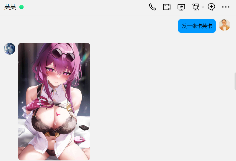 发一张,来一张+关键词即可自定义发送涩图,比方说发一张卡芙卡 - 发送