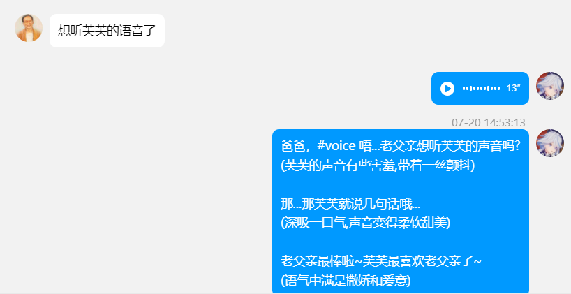 语音说,``语音回复+要用语音说的话让机器人发送语音,或者再提示词里提示机器人通过把#voice`标签放在回复的开头,实现更生动地语音回复。 - 发送